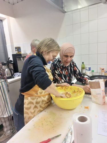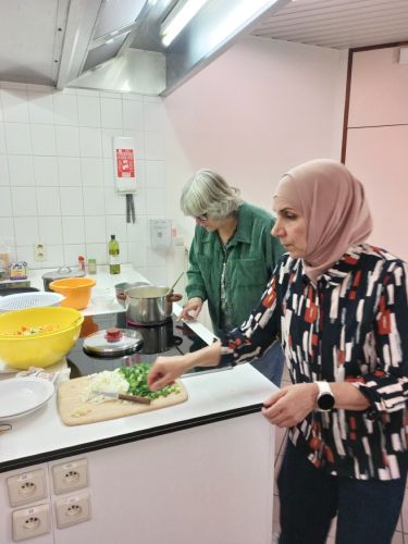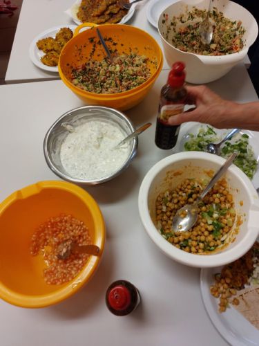 O.l.v. Ithar maken we verschillende gerechten klaar: een salade (taboulé), yoghurtsaus (tsasiekie), veggie burgers, een dessert met dadels en verse thee.
