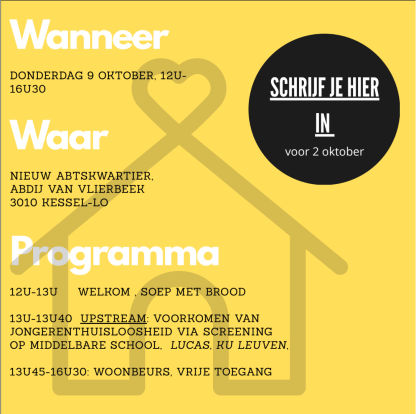 Voorafgaand aan de woonbeurs licht KU Leuven de resultaten toe van Upstream, een preventief project dat ingezet kan worden in middelbare scholen ter preventie van schooluitval en jongerenthuisloosheid.