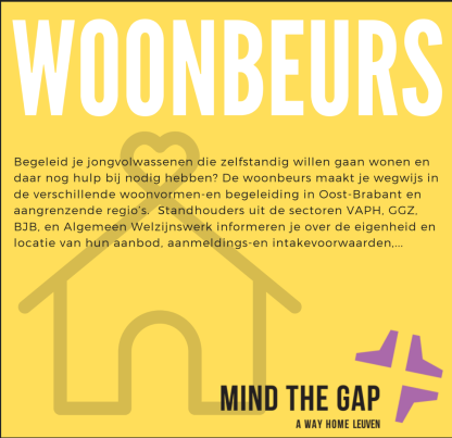 Op 9 oktober organiseert Mind the Gap Leuven een woonbeurs voor hulpverleners die werken met kwetsbare jongvolwassenen. De beurs geeft een overzicht van de verschillende woonvormen-en begeleidingen voor jongvolwassenen die op eigen benen willen staan maar hier nog wat hulp bij nodig hebben. Aan de woonbeurs neemt een breed scala van standhouders deel uit Oost-Brabant: organisaties die woonbegeleiding aanbieden vanuit de sectoren jeugdhulp, personen met een beperking en personen met een psychische kwetsbaarheid, maar eveneens verschillende co-housingsinitiatieven, OCMW, Huurhuis, Directe Opvang …